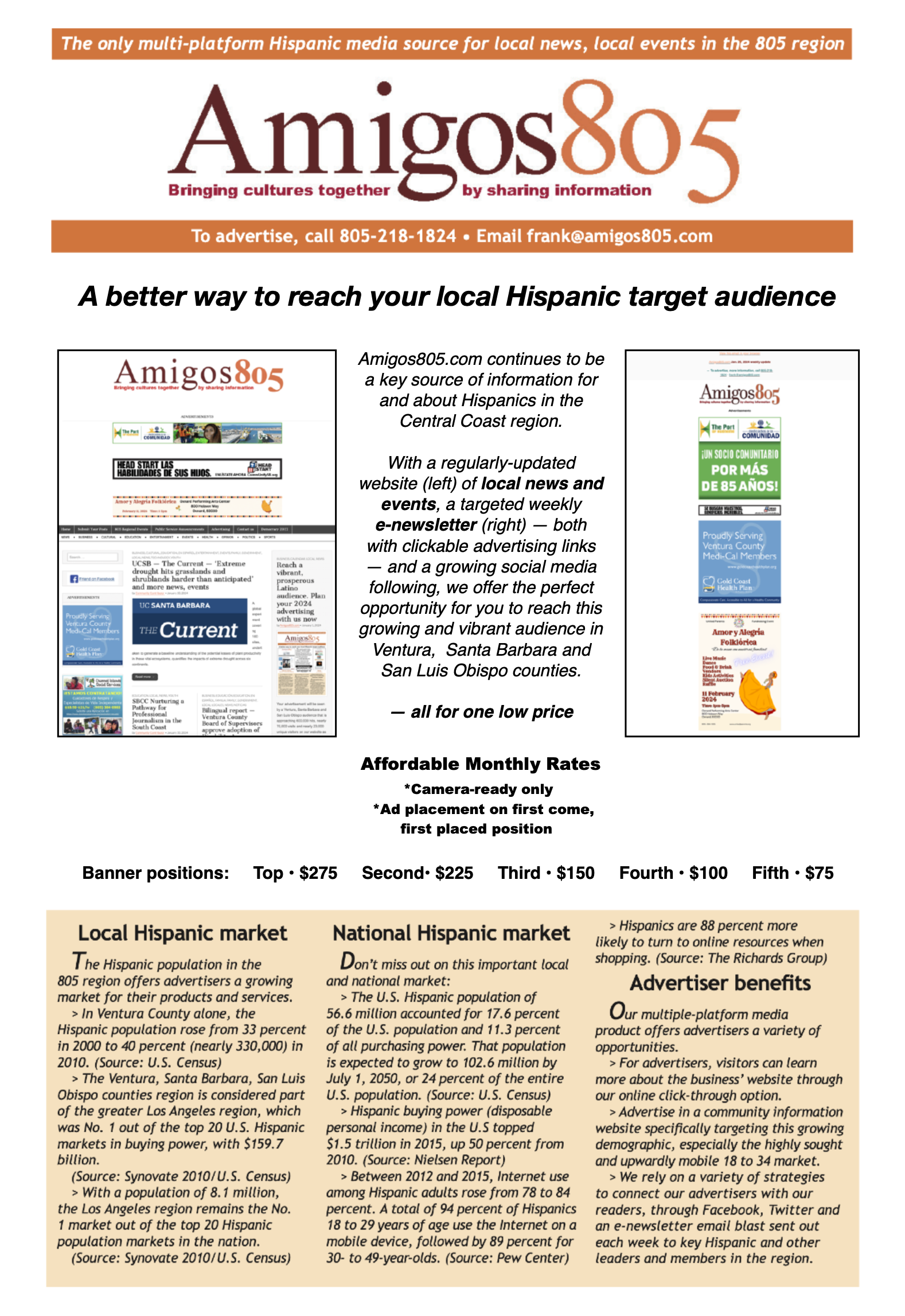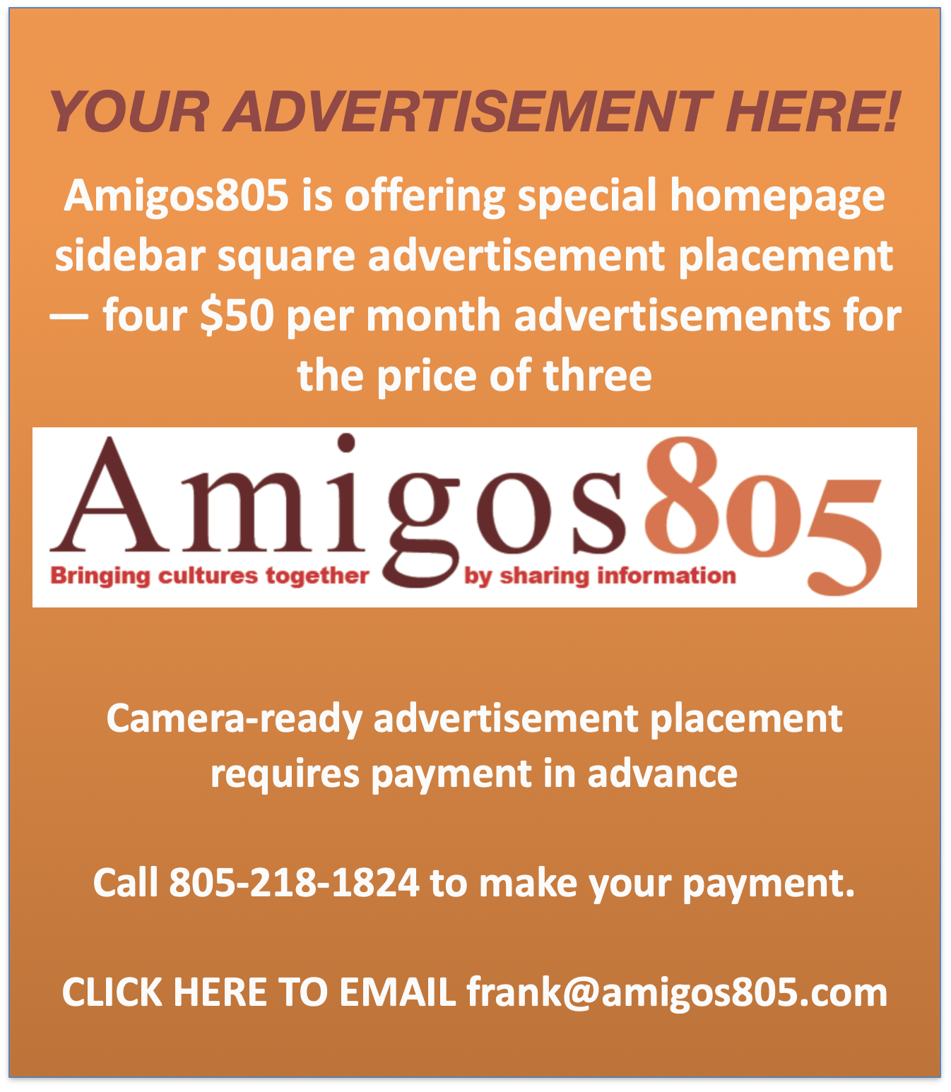 Call us at 805-218-1824 or send an email to frank@amigos805.com to receive a copy of our advertising rate sheet.