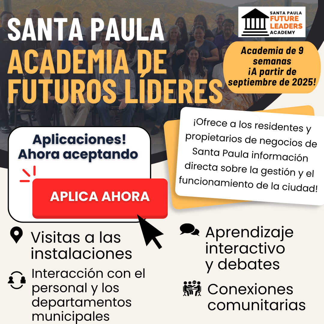 Applications are open now for Santa Paula residents and business owners age 18 and older. The deadline to apply is August 29, 2025. Space is limited to 30 participants to allow for meaningful interaction. A $50 program fee is due prior to the start of the academy.