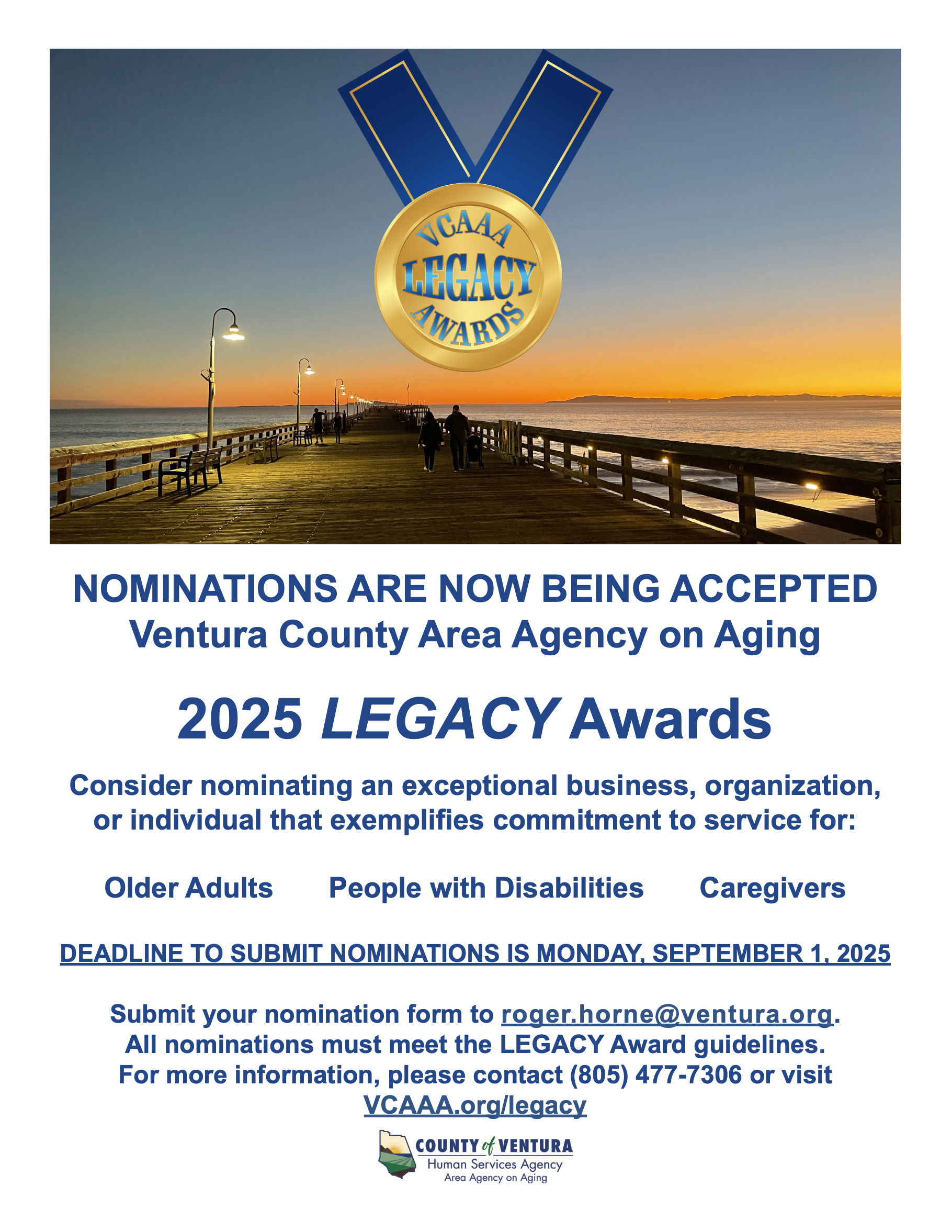 VENTURA — The nomination period for the Ventura County Area Agency on Aging’s LEGACY Awards is now open. These awards recognize the contributions of Ventura County residents and businesses that are dedicated to helping older adults, people with disabilities, and their caregivers, to live optimally.