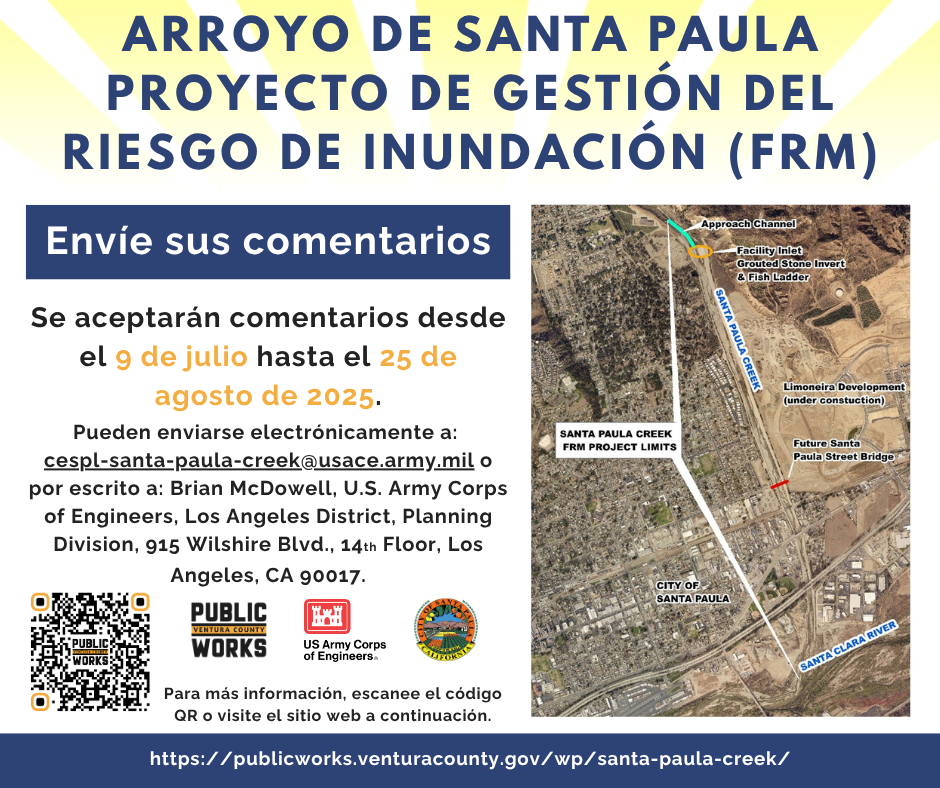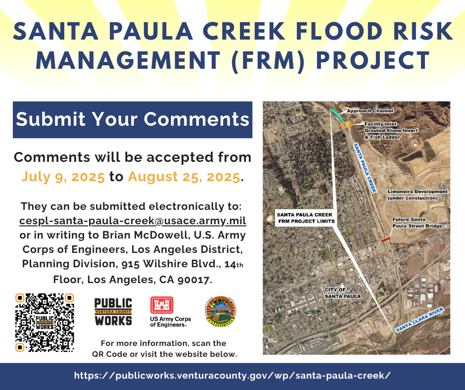 VENTURA — The Ventura County Public Works Agency – Watershed Protection District (VCPWA-WPD), in collaboration with the U.S. Army Corps of Engineers (USACE), is accepting public comments for the Santa Paula Creek Flood Risk Management Project.