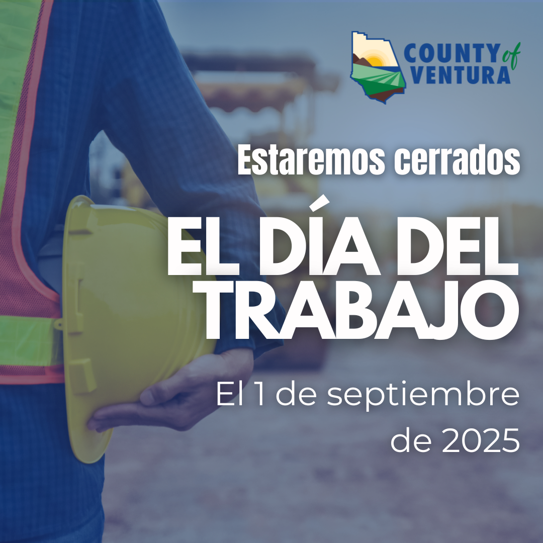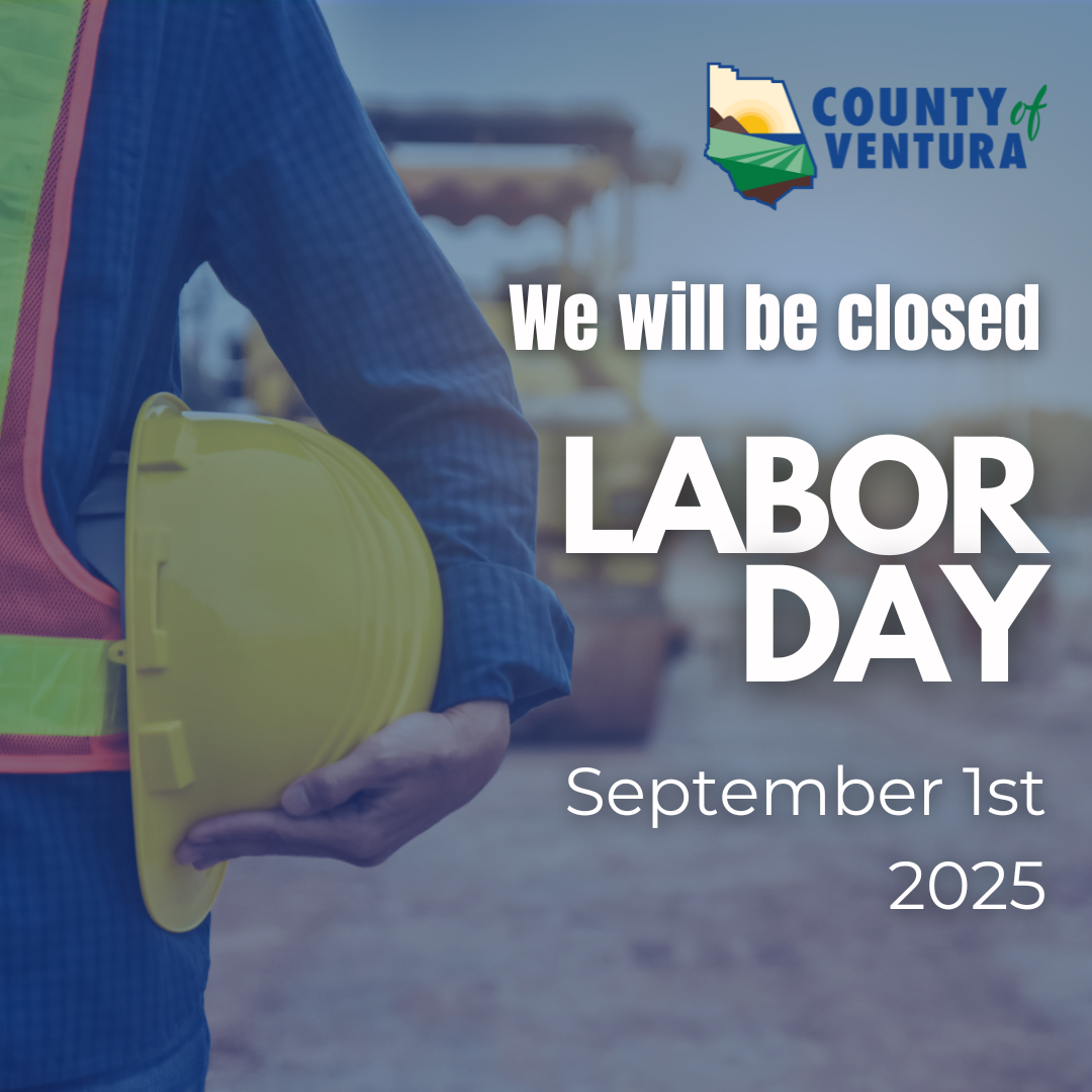 County of Ventura offices will be closed on Monday September 1, 2025 in observance of Labor Day and will reopen Tuesday September 2, 2025. Have a great Labor Day weekend!