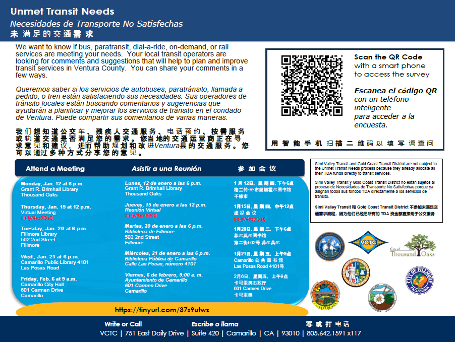 Your local transit operators are looking for comments and suggestions that will help to plan and improve transit services in Ventura County. You can share your comments in a few ways.