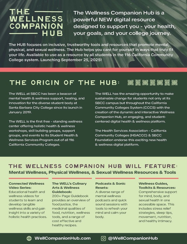 Through the interactive The Wellness Companion Hub, SBCC’s The WELL has the opportunity to make sustainable change for students not only at its SBCC campus but also throughout the California Community Colleges System (CCCS). The Health Services Association for California Community Colleges (HSACCC) and the SBCC Foundation both endorse the innovative platform.