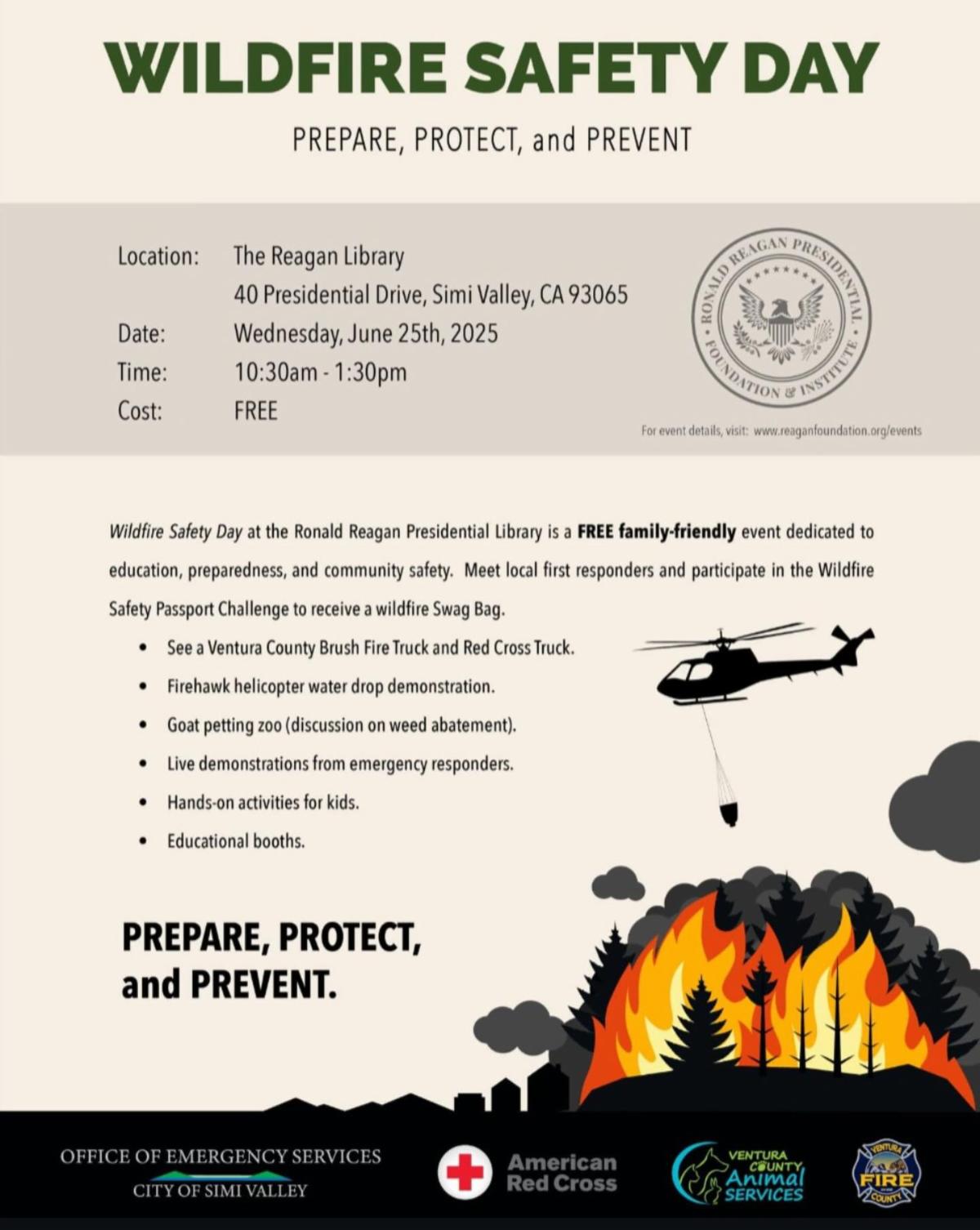 First, I hope you’ll join us for Wildfire Safety Day — a free, family-friendly event at the Ronald Reagan Presidential Library on Wednesday, June 25, from 10:30 am to 1:30 pm. This fun and informative day will include: