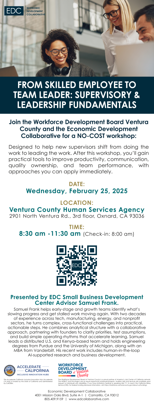 The Economic Development Collaborative (EDC) is a 501(c)3 nonprofit committed to enhancing regional quality of life through business development services and strategic initiatives that support the greater Ventura and Santa Barbara County area. Thanks to our countless partners, EDC’s business consulting, upskilling opportunities, low-interest lending and recovery resources are provided at NO-COST!