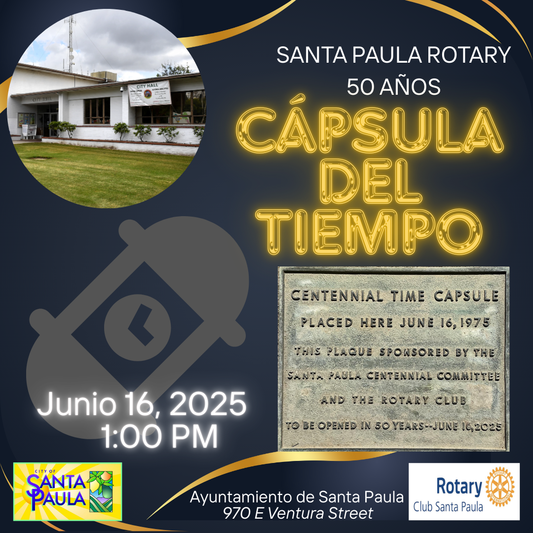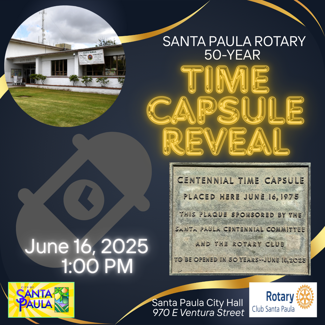 SANTA PAULA — The Rotary Club of Santa Paula and the City invite the community to a historic and memorable event: the unearthing and reveal of Santa Paula’s Centennial Time Capsule on Monday, June 16, 2025, at 1:00 PM in front of Santa Paula City Hall, located at 970 E. Ventura St., Santa Paula, CA 93060.