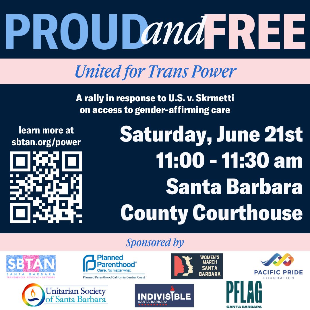 This event is part of a national day of action organized by Lambda Legal and the ACLU, with local events taking place in cities across the country. The Santa Barbara rally is hosted by the Santa Barbara Transgender Advocacy Network (SBTAN) in partnership with Pacific Pride Foundation, PFLAG Santa Barbara, Planned Parenthood California Central Coast, Unitarian Society of Santa Barbara, Indivisible Santa Barbara, and Women’s March Santa Barbara.Join us in community and resistance. Trans lives are not up for debate—trans lives are proud, powerful, and free.