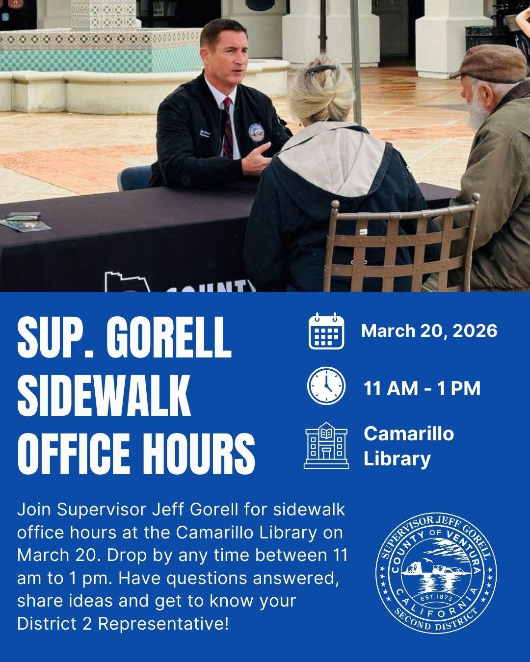 You’re invited to join me for Sidewalk Office Hours at the Camarillo Library located at 4101 Los Posas Road in Camarillo on Friday, March 20 from 11:00 AM to 1:00 PM. These informal office hours are a chance for residents to connect directly with me—whether you have a question, an idea to share, or simply want to talk about what’s happening in our community. No appointment is needed. Just drop in anytime. I’ll be out front by the fountain. I value the opportunity to hear directly from you and look forward to seeing you there!
