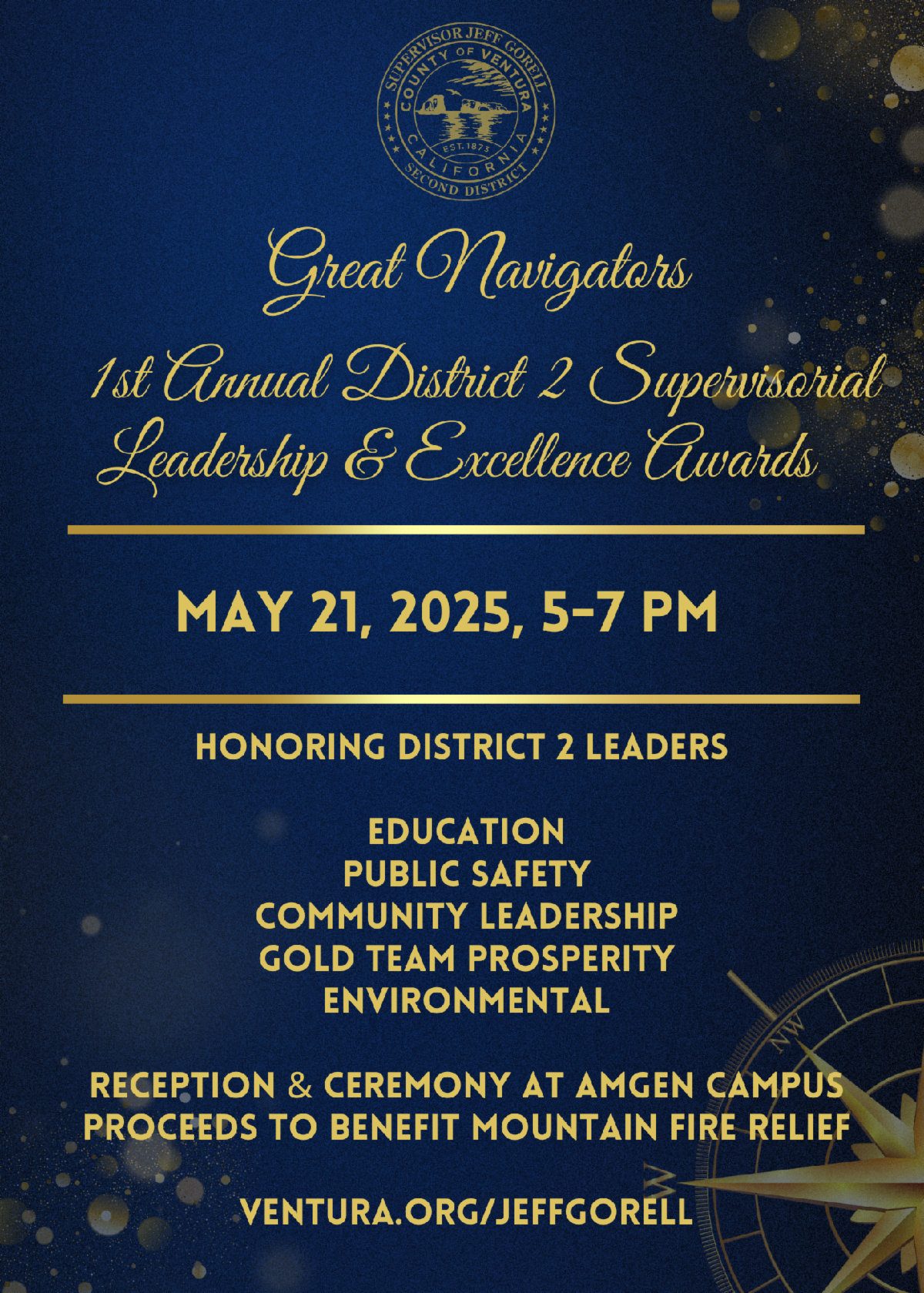 You’re invited to join me for a special evening celebrating the incredible leaders who make a difference in District 2. This 1st annual District 2 Supervisorial Leadership and Excellence Awards event will be held May 21from 5-7 at the stunning Amgen Campus in Newbury Park. Together, we will honor those who inspire, lead, and serve our community with dedication and vision.