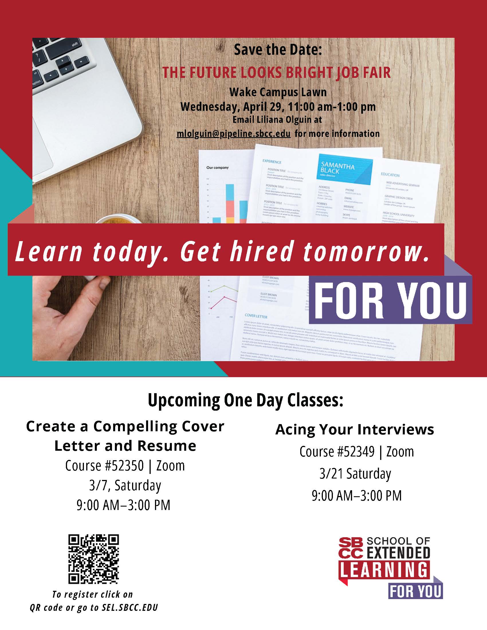 Boost your career with SBCC School of Extended Learning’s Career Skills Institute courses. Our courses are designed to help you land a job, get promoted, or build your business. Earn a certificate and digital badge to prove your skills and stand out to employers. Ready to sharpen your negotiation skills or build a foundation in computer or design skills? SBCC Career Skills Institute offers the courses and certificates you need to stay competitive and confident in today’s job market. Save the Date: April 29, THE FUTURE LOOKS BRIGHT Job Fair. Find out more at https://www.sbcc.edu/extendedlearning/job_fair.php
