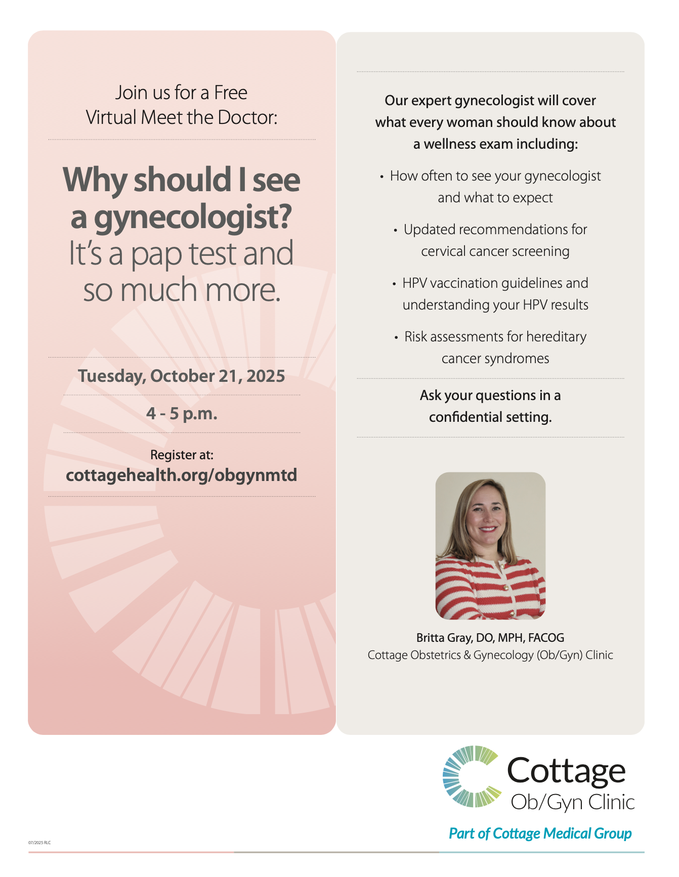 SANTA BARBARA —The Cottage Ob/Gyn Clinic will host a free virtual “Meet the Doctor” event on Tuesday, October 21, 2025, from 4:00 to 5:00 p.m. The program will feature Dr. Britta Gray, a board-certified specialist in obstetrics and gynecology, who will discuss women’s wellness exams and the importance of regular gynecologic care.