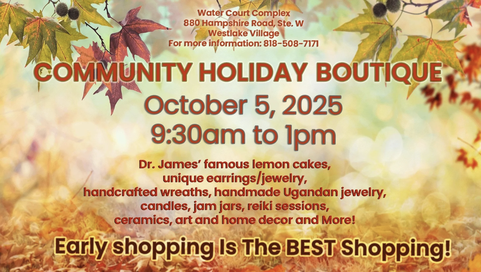 A Community Holiday Gift Boutique gets underway Sunday, October 5th from 9:30am to 1:00pm at the beautiful Water Court Complex, 880 Hampshire Road, Ste W in Westlake Village. A multitude of vendors will be showcasing delectable desserts, unique jewelry, handcrafted wreaths, candles, jams, ceramics, art & home decor, and more. Reiki sessions are also available. Adding an international flair, a collection of handmade creations from Uganda, courtesy of The Greater Contribution, will also be among the items available for purchase.