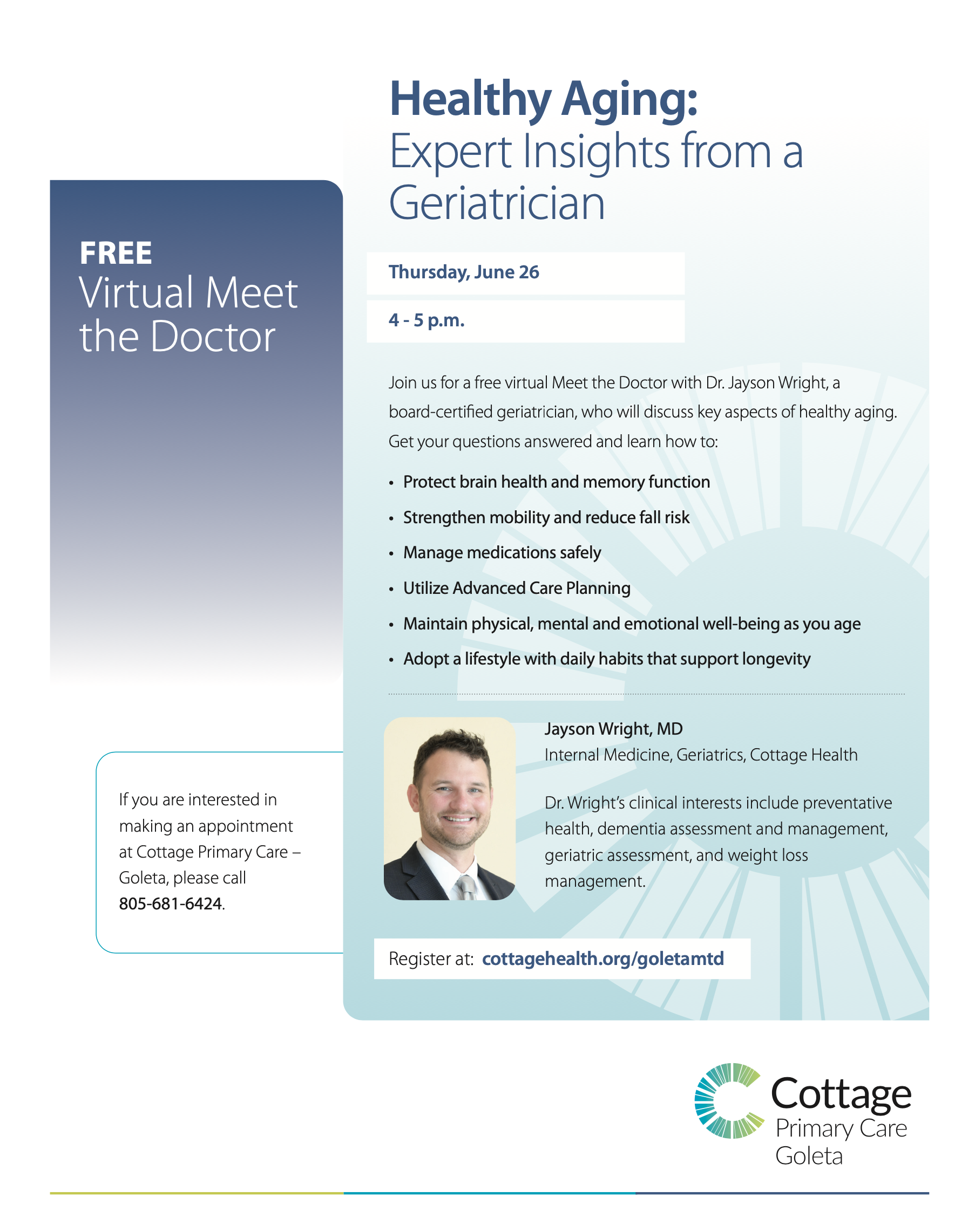 Business, Health, Local, News June 26 — Cottage to host FREE virtual Meet the Doctor Healthy Aging: Expert Insights from a Geriatrician by Community Contributor • January 1, 2025 CLICK HERE FOR MORE INFORMATION Read more →