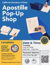 Educación, Education, Elections, En español, Events, familia, Family, Government, Immigration, Local, Locales, News, Noticias July 29 — Bilingual report — Ventura County Clerk-Recorder partners with California Office of the Secretary of State to host Apostille Pop-Up Shop program by Community Contributor • January 1, 2025 CLICK HERE FOR MORE INFORMATION Read more →