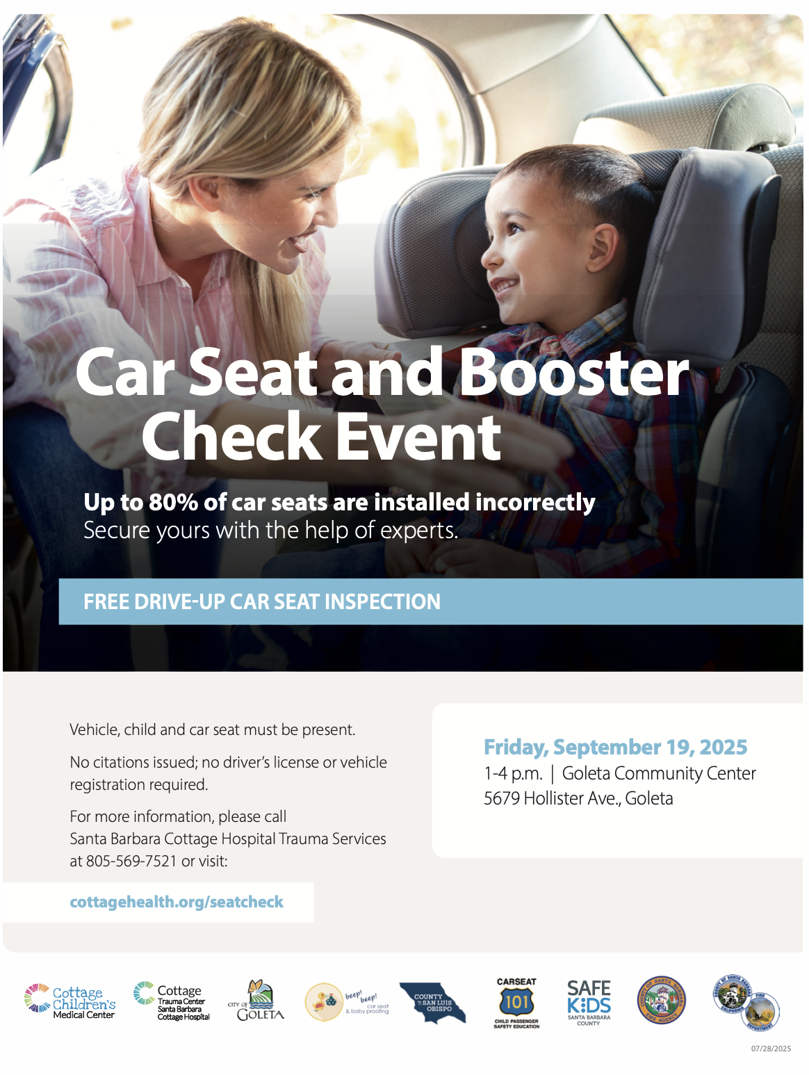 SANTA BARBARA — Santa Barbara Cottage Hospital Trauma Services and several local agencies to host a FREE drive-up child car seat and booster check event on Friday, September 19, from 1:00 to 4:00 p.m. at Goleta Community Center (5679 Hollister Ave., Goleta). No prior registration is required.