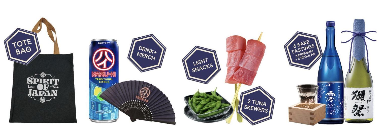 6 sake tastings total (3 premium + 3 regular), 2 Japanese tuna skewers (1 akami + 1 fatty toro), Light snacks (e.g., edamame, etc.), VIP Area access (seating/lounge area), Early Entry: 11am (VIP only), Mini gifts (drinks + merchandise), Original tote bag