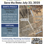 Santa Paula Creek is a tributary to the Santa Clara River located along the east side of the City of Santa Paula. The project aims to reduce flood risk and enhance community safety. Following two early public scoping meetings held in July, the public is encouraged to provide feedback to help guide the study’s scope, shape possible measures and alternatives, and assess potential environmental impacts.