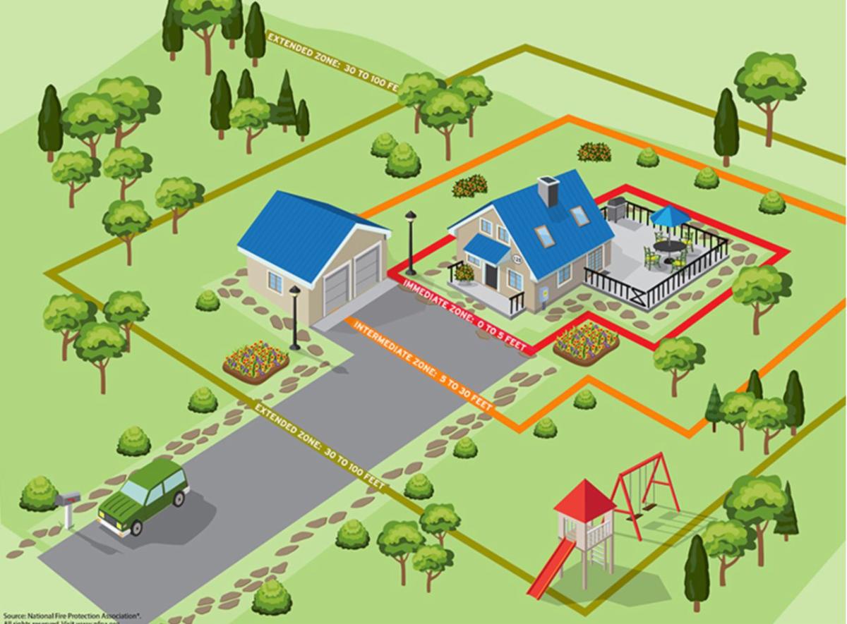 • Zone 0 covers the area within five feet of a home, including decks and stairs.