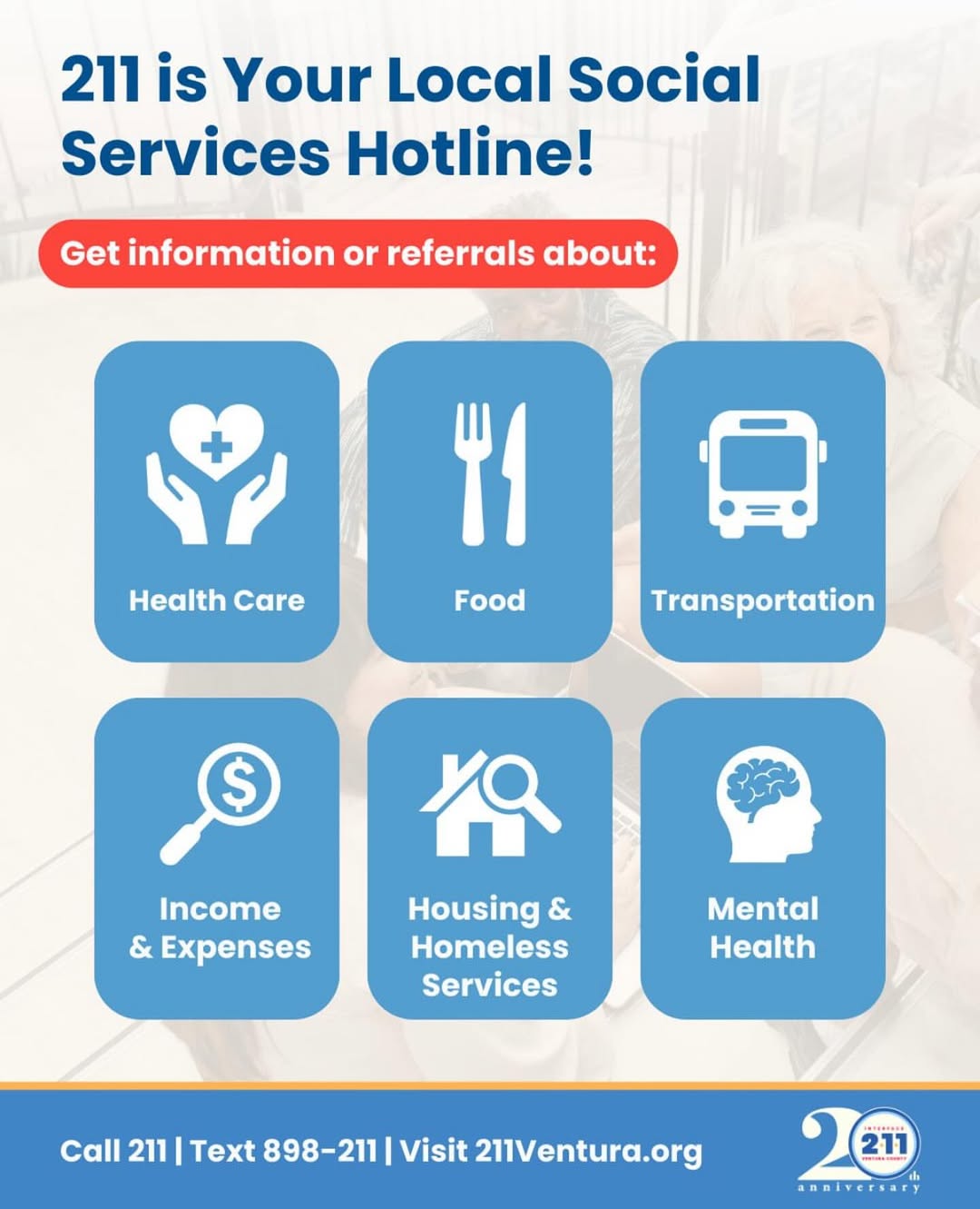 Call 2-1-1 anytime, day or night, for free and confidential help. 211ventura.org