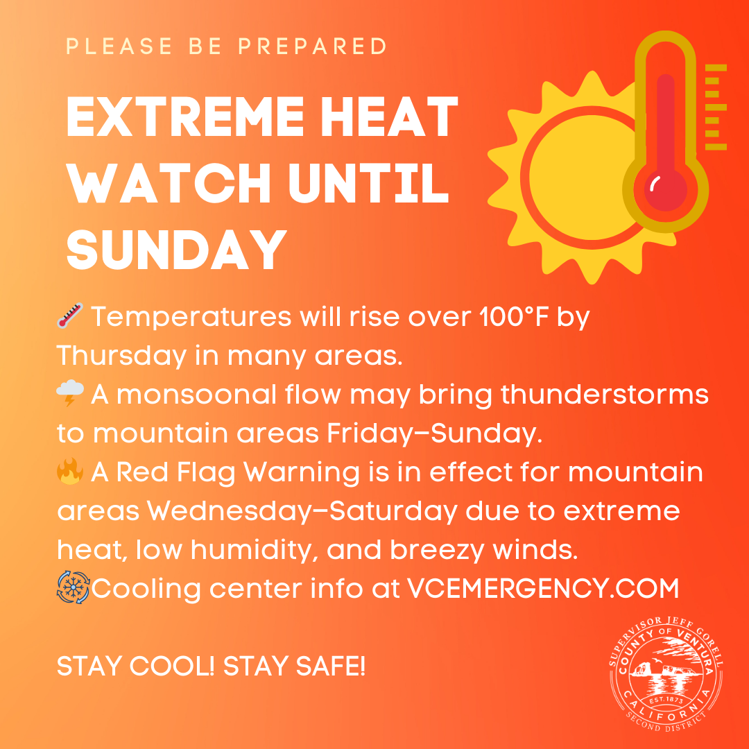 Extreme Heat Alert: The Ventura County Sheriff’s Office of Emergency Services and the National Weather Service are monitoring a multi-day heat event expected through Sunday.
