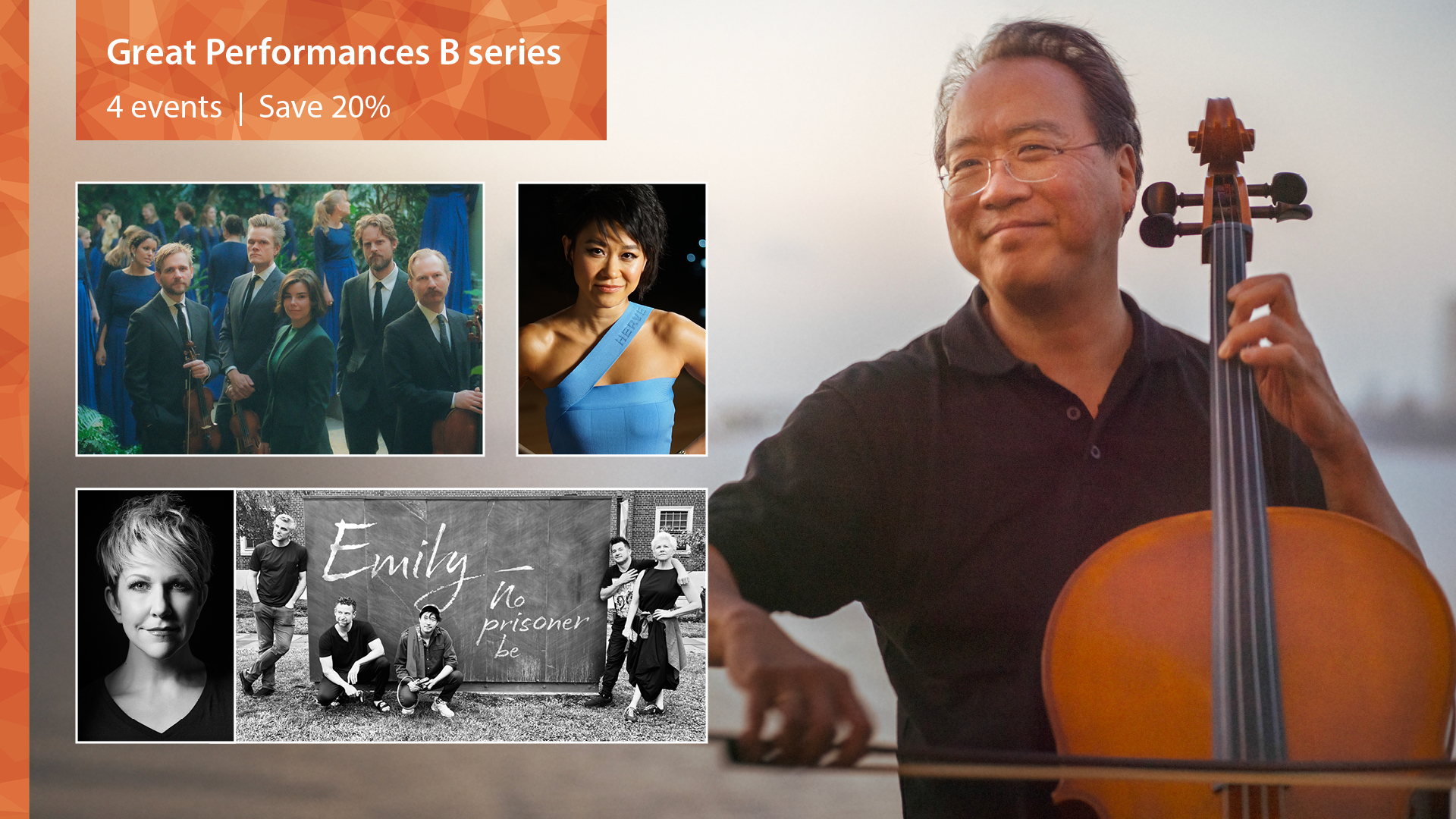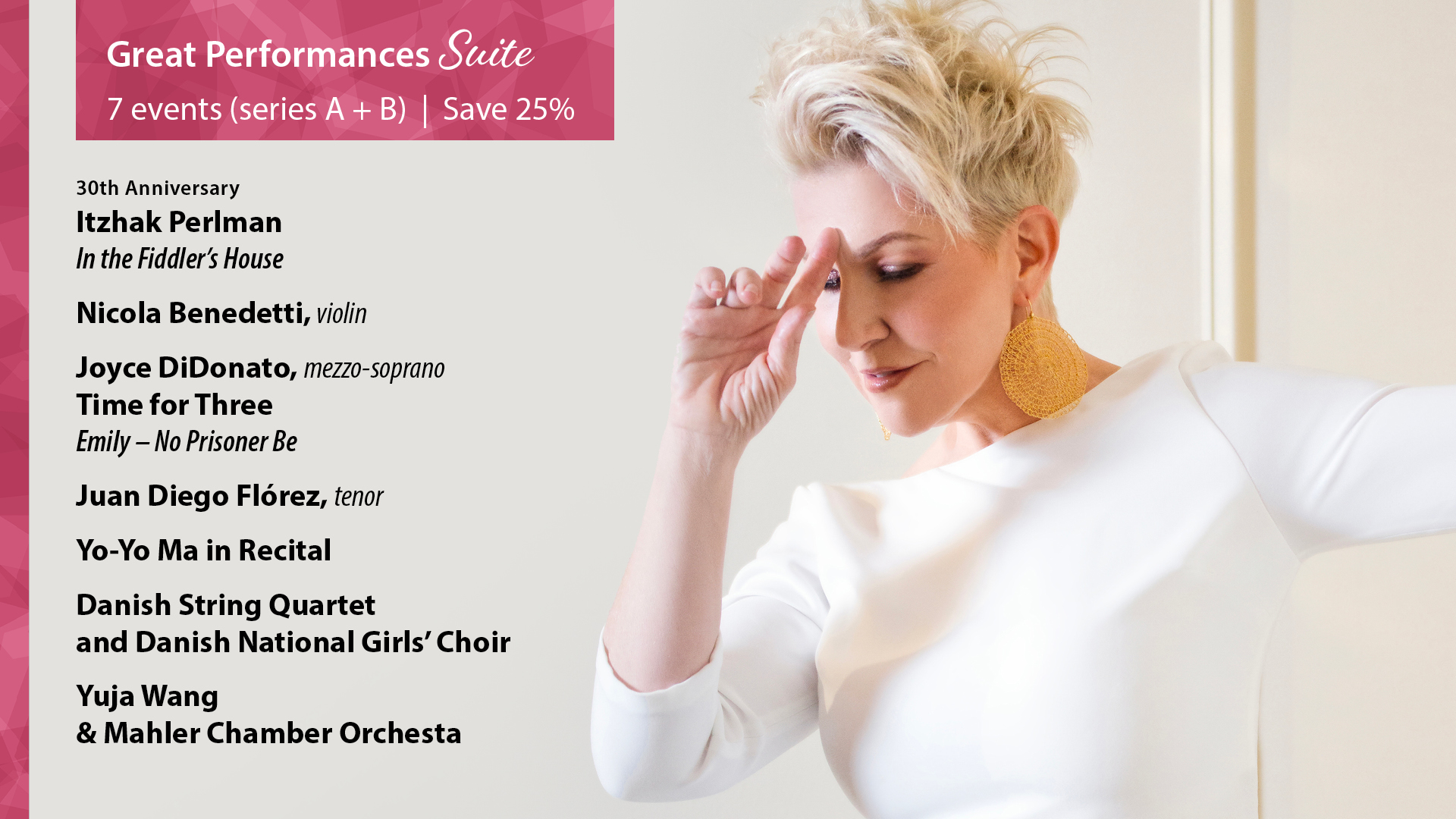 For increased savings and a suite deal, combine the Great Performances A and Great Performances B series into the Great Performances Suite (seven events) and the curated subscription discount increases from 20% to 25%! The Great Performances Suite includes tickets for all seven events in Great Performances A and B series for one low price.