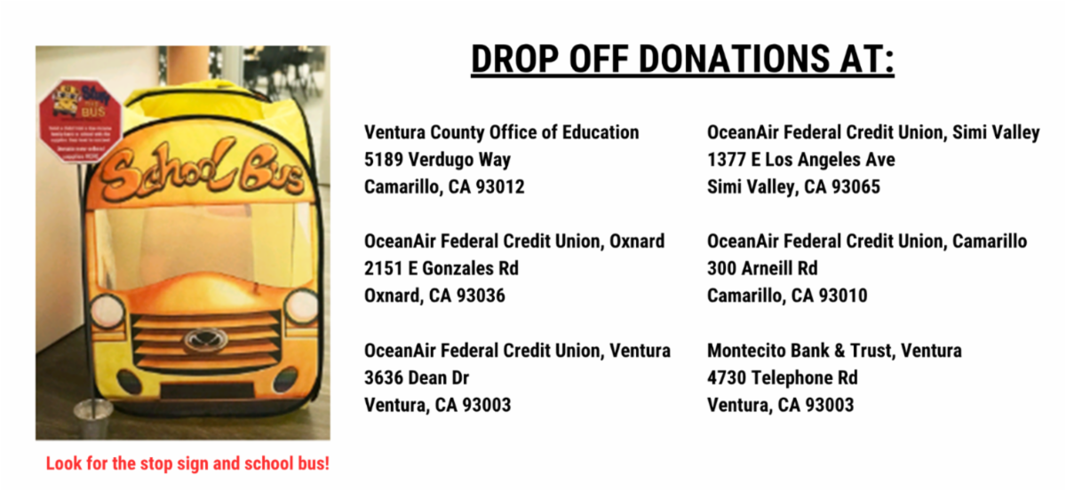 The final day to drop off donations will be Friday, July 18th. Help us reach our goal of donating 1,000 backpacks stuffed with essential school supplies for homeless middle schoolers in Ventura County. When dropping off your donation, look for the pop-up bus and stop sign. Please note that only brand-new school supplies will be accepted.
