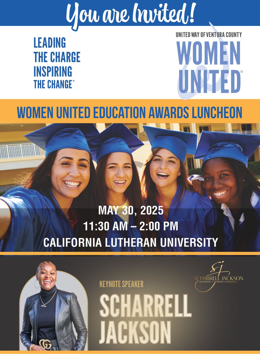VENTURA COUNTY — We’re thrilled to announce Scharrell Jackson, celebrated author with over 25 years of executive leadership experience, as our keynote speaker for the Women United Education Awards Luncheon on Friday, May 30th at Cal Lutheran University. Scharrell is a champion of United Way’s collective community impact work, and we are honored to have her join us! Get your tickets today!