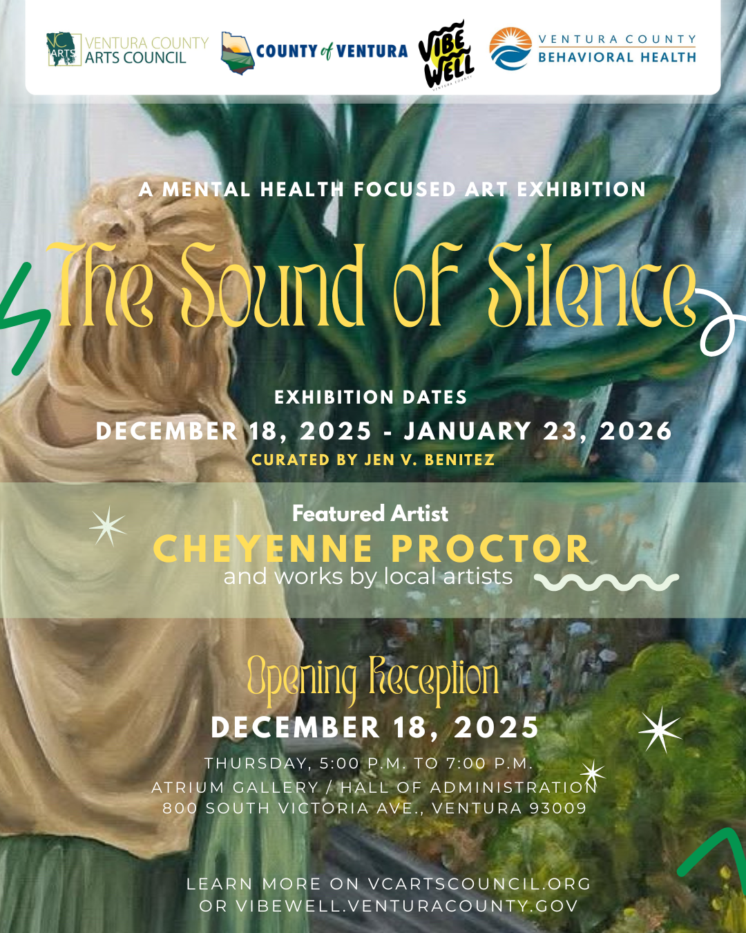 “The Sound of Silence” opens to the public at the Atrium Gallery TOMORROW, Dec. 18, with a free opening reception from 5:00 – 7:00 p.m. The exhibition, featuring work by artist Cheyenne Proctor and other local artists, runs through January 23, 2026.