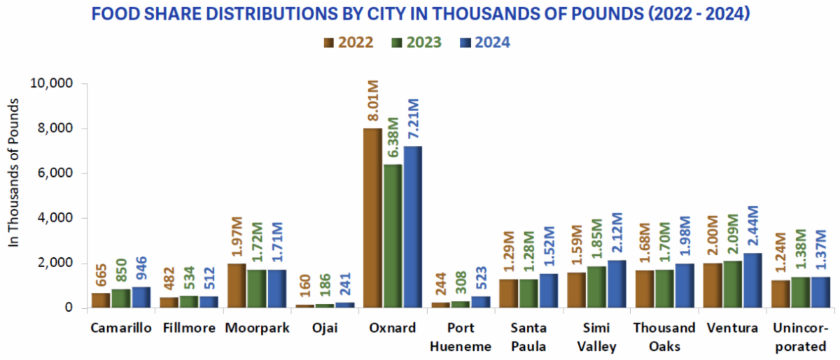 | In Ventura County, the main provider of food to people who don’t have enough is the nonprofit Food Share. Its task has never been bigger. In 2020, when the COVID-19 pandemic began and put thousands of people in Ventura County out of work, Food Share nearly doubled its food distribution from the year before, handing out 25.6 million pounds of food. The level of need has stayed nearly that high ever since. In 2024, Food Share distributed 20.6 million pounds of food, which works out to more than 20 meals for every person living in Ventura County. It was the second highest total in the organization’s history, after 2020. |