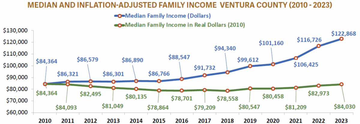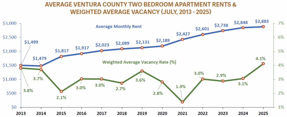 | Ventura County’s high cost of living is a recurring theme throughout years of State of the Region reports. Housing costs are the primary driver of the overall high cost of living. In June of 2025, the median price of existing single-family homes sold in Ventura County was $975,000. Rents, too, are quite high; the average rent for a two-bedroom apartment in July 2025 was $2,883.