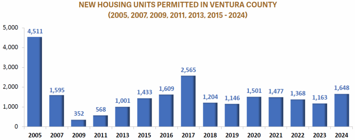 | One likely reason for this long-term increase in housing costs is a paucity of new homes. Ventura County’s “housing starts” — a term for the total number of new homes permitted by local government — have been at historically low levels ever since the bubble of the early 2000s burst. In most years since 2007, there have been fewer than 1,500 new homes permitted in all of Ventura County. In 2024, though, there were 1,648 housing starts, more than in any year since 2017. Thousands more units are either under construction or in their local government’s approval pipeline, which means the county could continue to add housing in the coming years, giving more relief to renters and their bank accounts.