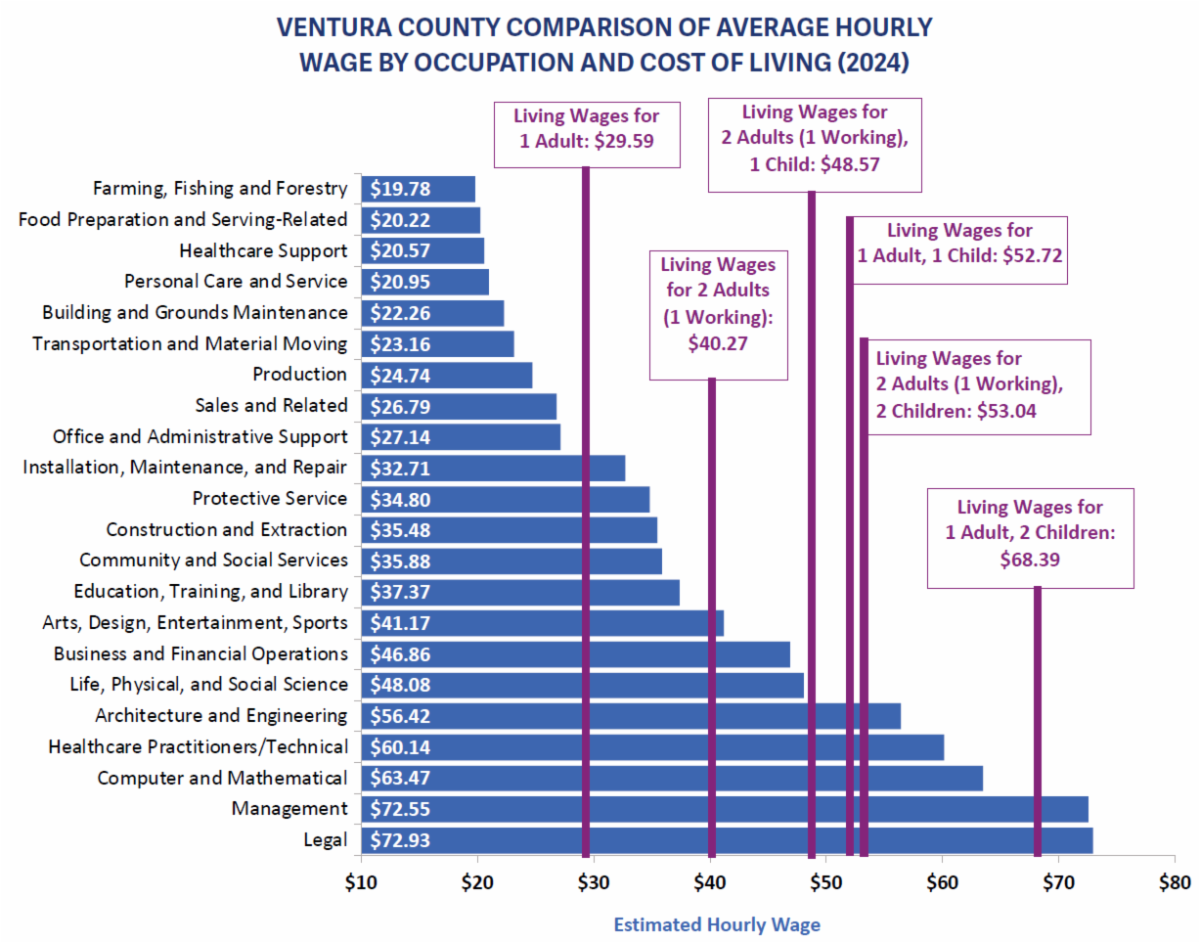 | Ventura County’s median personal and household incomes are relatively high, but they’re not high enough to keep up with our high cost of living. The State of the Region report includes data from the Living Wage Institute on how much a family must earn to afford just the basics in our region. The answer, most of the time, is more than many jobs in the county pay. For example, a single parent with one child needs to earn $52.72 an hour to afford the basics, such as housing, health care, child care, food and transportation. |