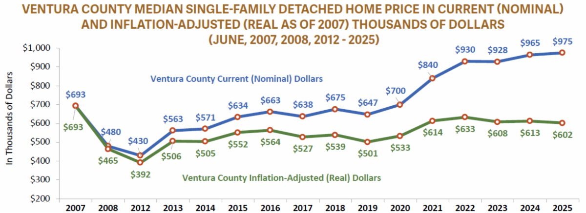 | Though Ventura County is a relatively expensive place to both rent and buy, costs in recent years have flattened and even declined when adjusted for inflation. The median home price, after climbing dramatically from 2019 to 2022, grew only 5% from 2022 to 2025. In inflation-adjusted terms, that represents a decrease of 5% over those three years. |