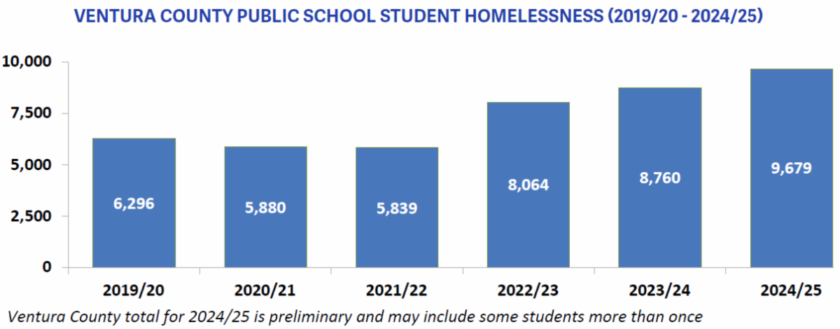 | Perhaps even more distressing than the number of homeless people are the number of children who are in or near homelessness. According to the Ventura County Office of Education, 9,679 public school students in Ventura County had inadequate housing at some point in the 2024/25 school year. The vast majority aren’t actually homeless, but are living in motels or shared housing due to economic necessity. This problem is getting worse: the number of students living in these conditions has gone up for three years in a row, with a total increase of 66% between the 2021/22 and 2024/25 school years. |