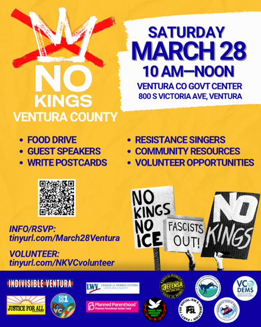Once again, the local coalition of pro-democracy organizers from Indivisible Ventura, Justice For All Ventura County, and 50501 VC are hosting the No Kings Ventura County event March 28, from 10 AM to Noon, at the Ventura County Government Center, on the corner of S. Victoria Ave. and Telegraph Rd. in Ventura.