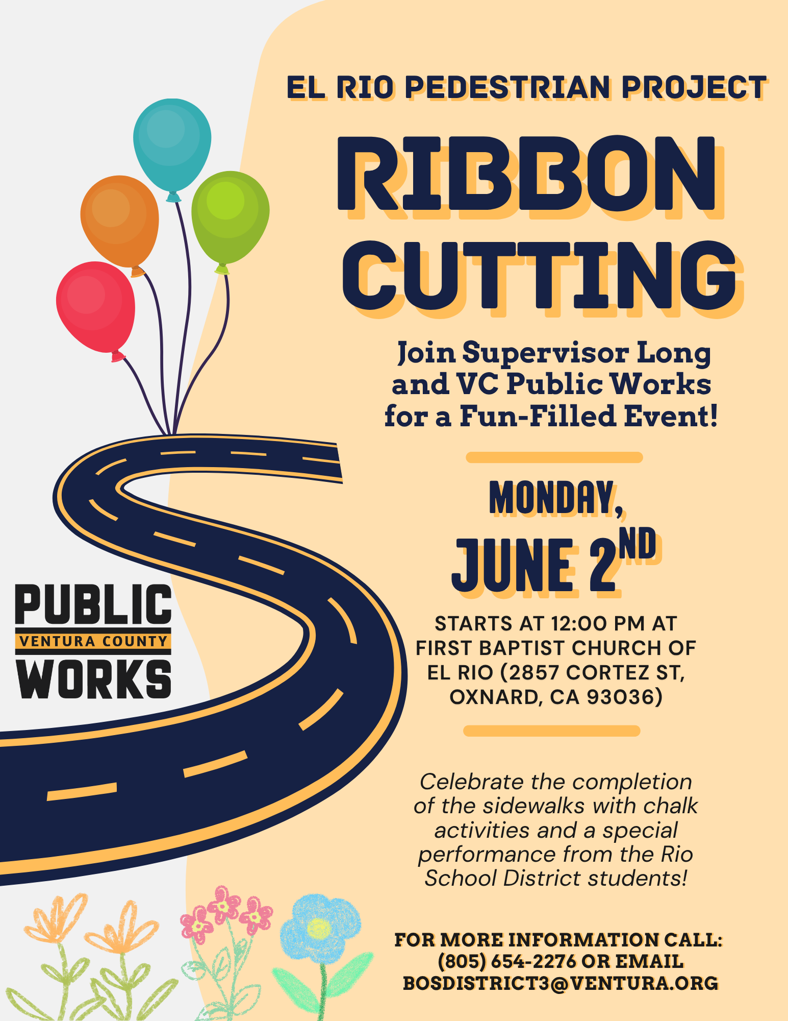 VENTURA — Supervisor Kelly Long’s Office and the Ventura County Public Works Agency (VCPWA) will host a ribbon cutting ceremony to celebrate the completion of the El Rio Pedestrian Improvements Project on Monday, June 2 at 12:00 p.m. The event will take place in the parking lot of the First Baptist Church of El Rio, 2857 Cortez St., Oxnard.