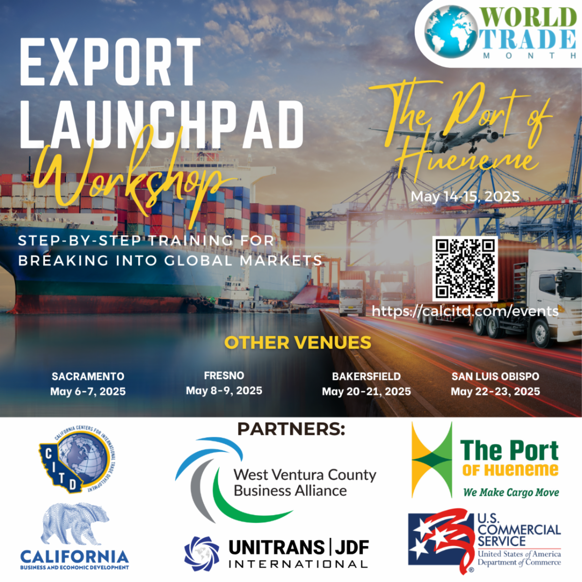 World Trade Month is approaching, and the Port of Hueneme is hosting the Export Launchpad Workshop on May 14-15, 2025. Partnering with the U.S. Commercial Service, California Governor’s Office of Business and Economic Development (GO-Biz), and the California Center for International Trade Development, this impactful two-day program is designed to propel small business owners and entrepreneurs into the global marketplace.